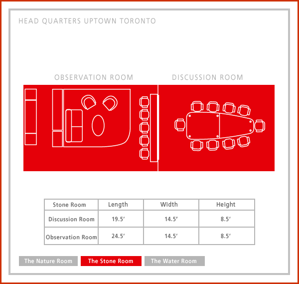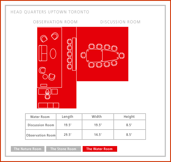 Full size boardroom format ( 3 different sized rooms available to accommodate interviews, regular focus groups and super groups): possibility of living room set-up |